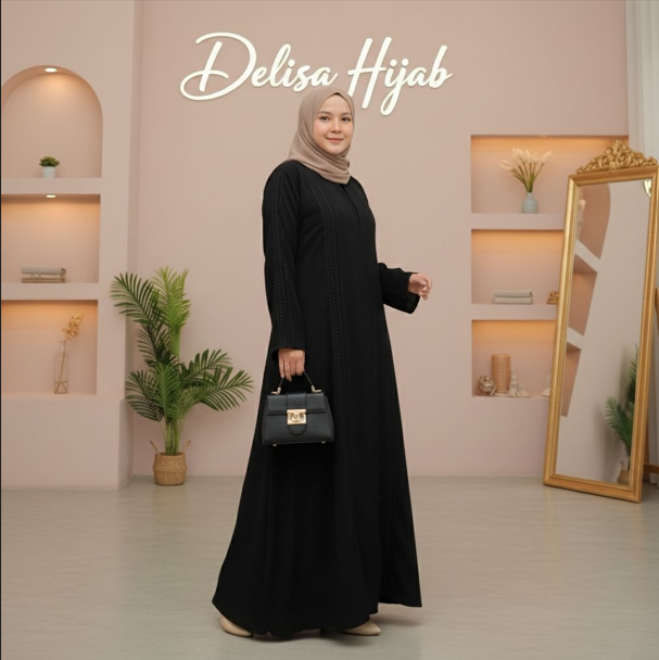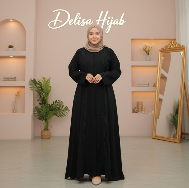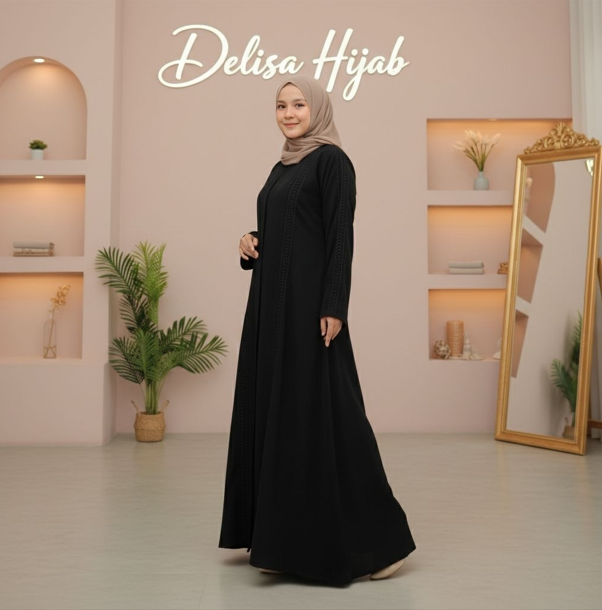 Shabira Abaya memakai kain jetblack galaxy.abaya ini memiliki tampilan yang modern dengan kombinasi renda dan payet