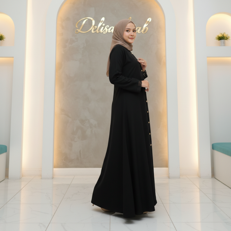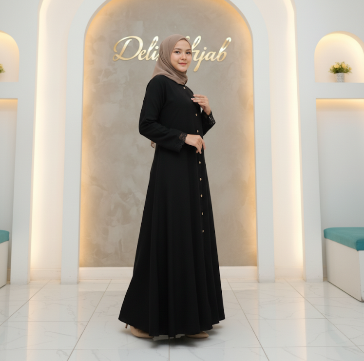 bahan jetblack galaxy premium dengan renda cantik di ujung lengan di padu dengan aksen kancing